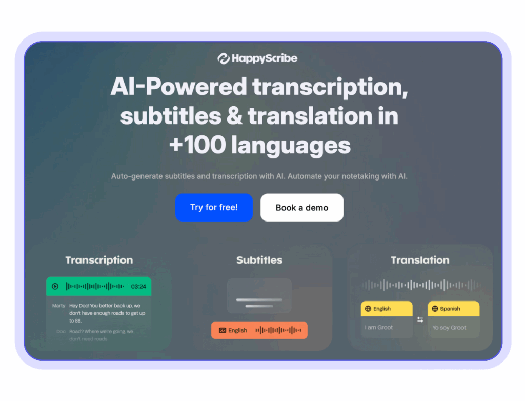 HappyScribe | Extensive language support | 120+ languages, human-verified transcripts, subtitles | From €0.20/min (AI) or €1.70/min (human) |
