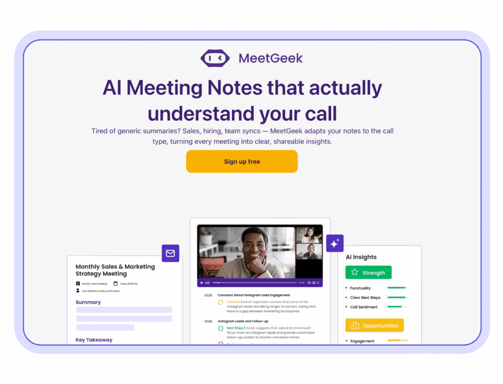 MeetGeek focuses on turning meetings into actionable notes. It automatically records and transcribes calls, then generates AI-powered summaries that can be customised to match your team’s needs. While it integrates smoothly with conferencing platforms, the free plan is restrictive, and transcripts can occasionally miss minor words.