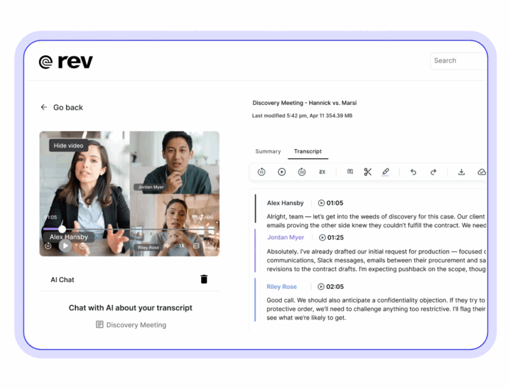Rev balances AI transcription with highly accurate human-powered services, making it one of the most recognised names in transcription. It’s especially useful for journalists, researchers, and businesses who need near-perfect accuracy, with human transcriptionists delivering up to 99%. The platform also supports captioning and subtitling for videos and includes collaborative editing tools, though some users find the AI features less polished than competitors.